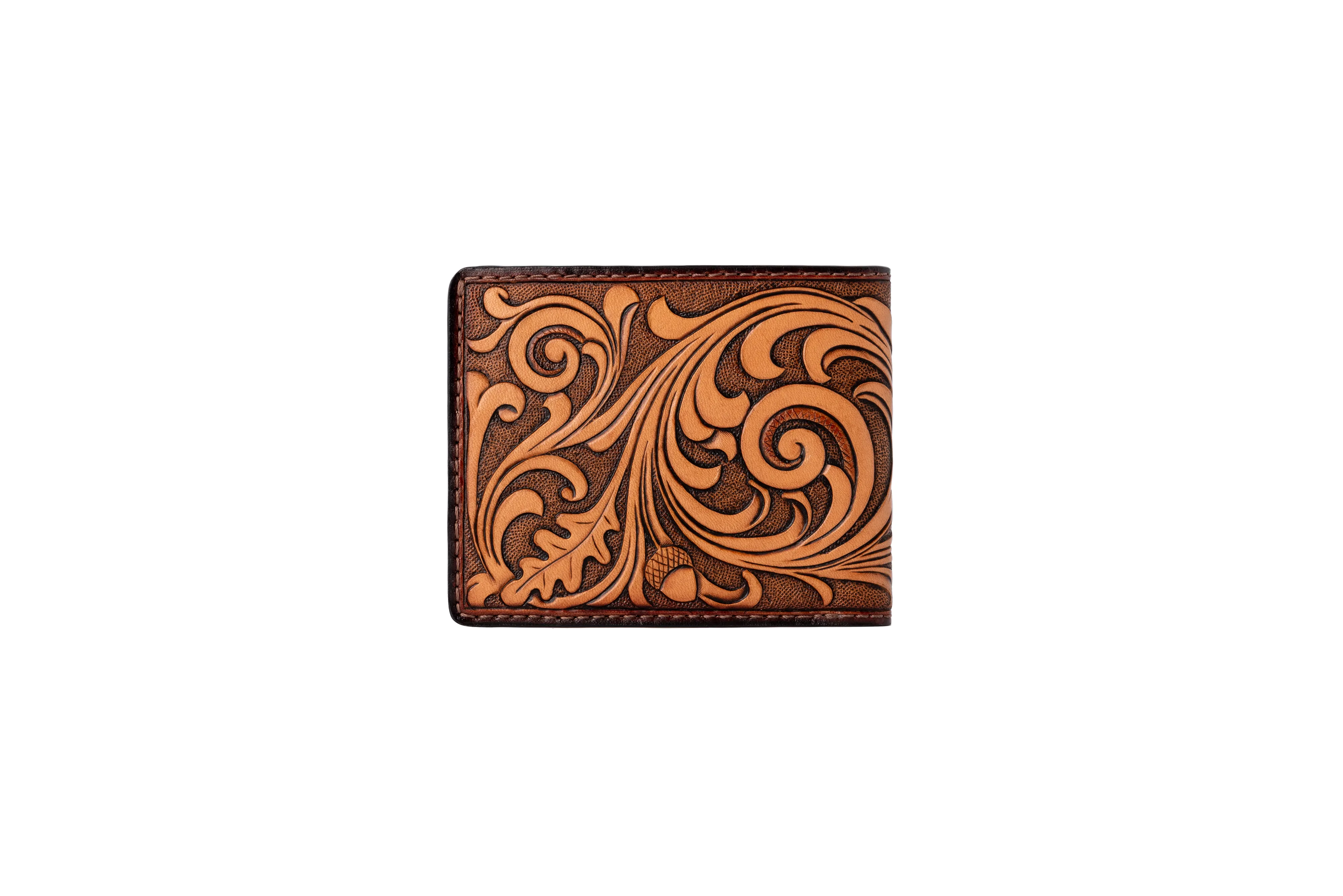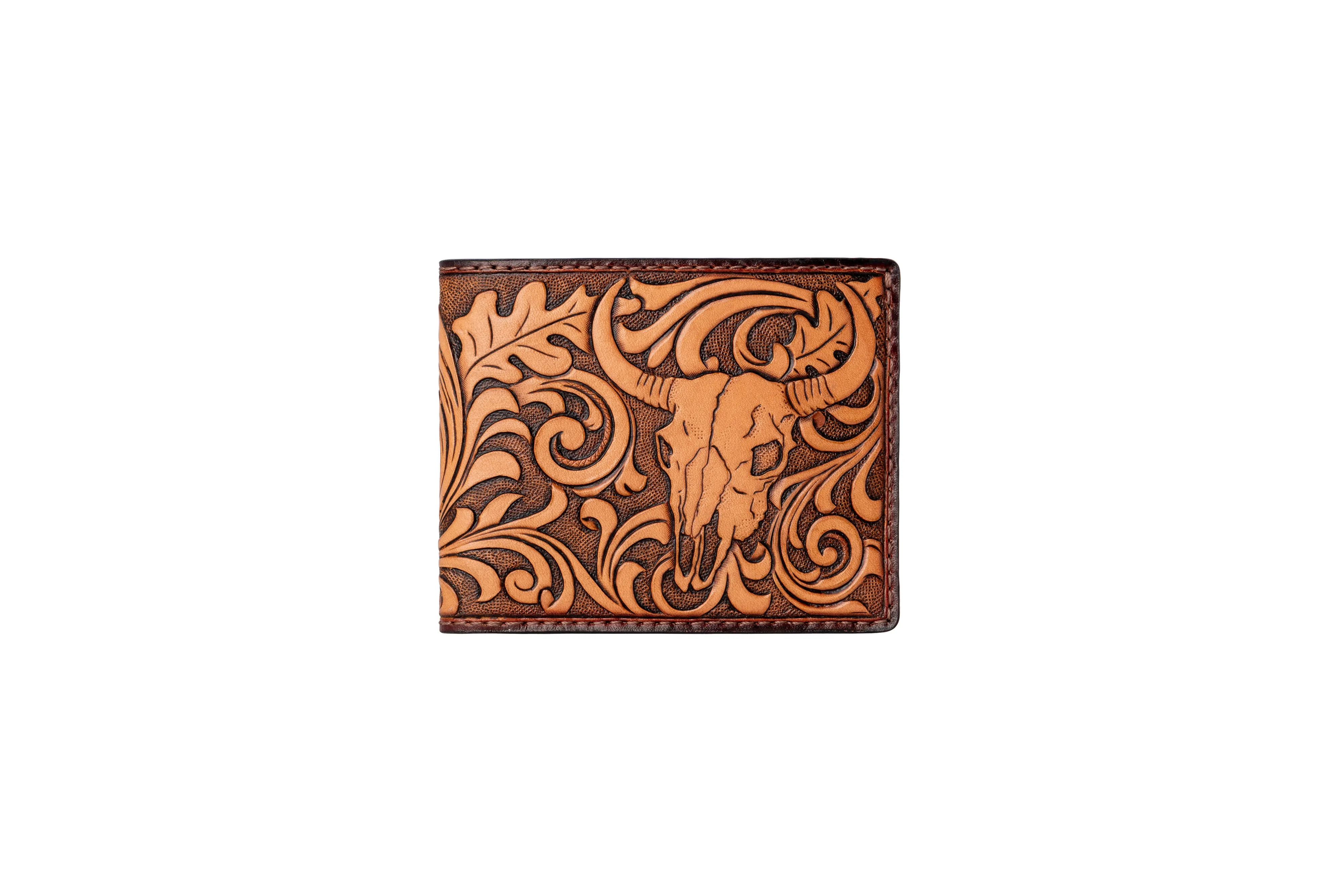 Crafted for those who appreciate true artistry, this hand-tooled leather wallet features a striking longhorn skull framed by flowing Western floral scrollwork. Every detail is carved by hand into premium vegetable-tanned leather, giving the piece depth, character, and a warm two-tone patina that will only get richer with age. Built to last a lifetime, the wallet is finished with precise stitching, a smooth fold, and a durable protective edge. Inside, it offers practical everyday organisation with space for cards, notes, and essentials—combining rugged style with dependable function.