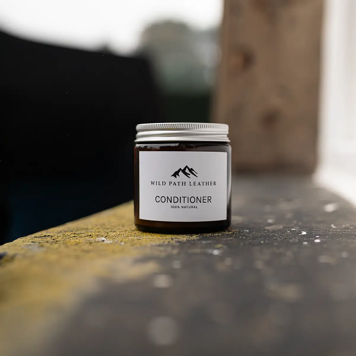 Nourish, protect, and restore your leather goods with our all-natural Wild Path Leather Conditioner. Meticulously handcrafted in small batches, this care product combines the rich conditioning powers of beeswax, cocoa butter, sweet almond oil, and carnauba wax to deeply hydrate and shield your leather from drying, cracking, and wear. Perfect for boots, bags, belts, saddlery, and heritage leather goods, this conditioner enhances the natural grain, adds a subtle sheen, and prolongs the life of every leather piece. (Not suitable for suede or nubuck).