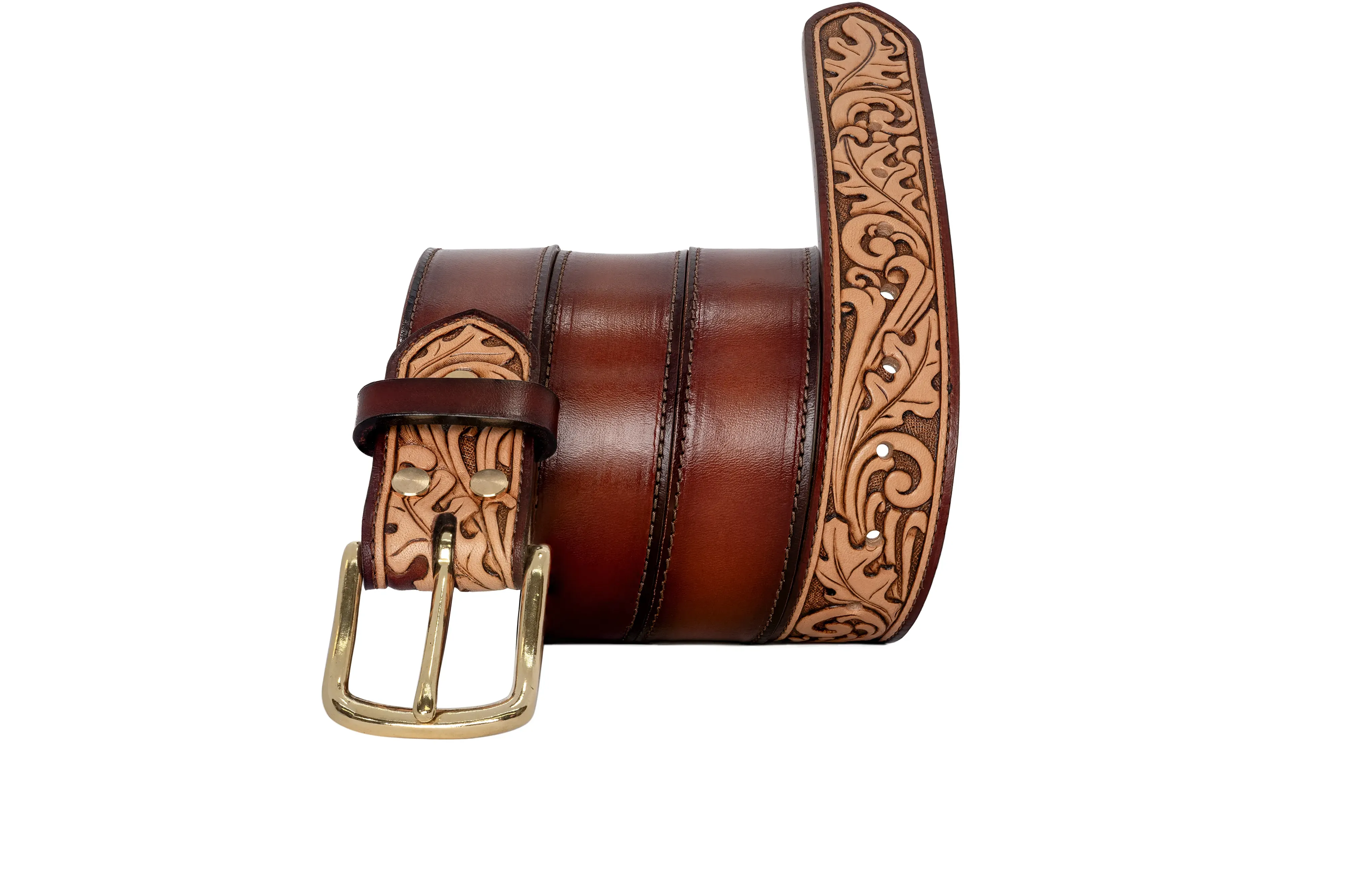 This striking belt combines rich craftsmanship with bold style. Made from premium full-grain vegetable-tanned leather, it features a deep mahogany-dyed center framed by a beautifully hand-tooled floral border in natural tan. The contrast of tones highlights the artistry of traditional leather tooling while giving the belt a refined, distinguished character. Finished with a polished solid brass buckle, secured by double rivets, and hand-burnished edges, this belt is built to last a lifetime. The two-tone design makes it versatile—perfect for pairing with jeans, dress trousers, or as a standout accessory for special occasions.